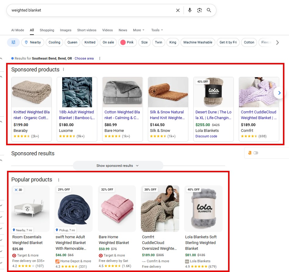 We identified these shopping keywords by looking exclusively for search results where a shopping box was present (either paid or organic shopping boxes). Example: