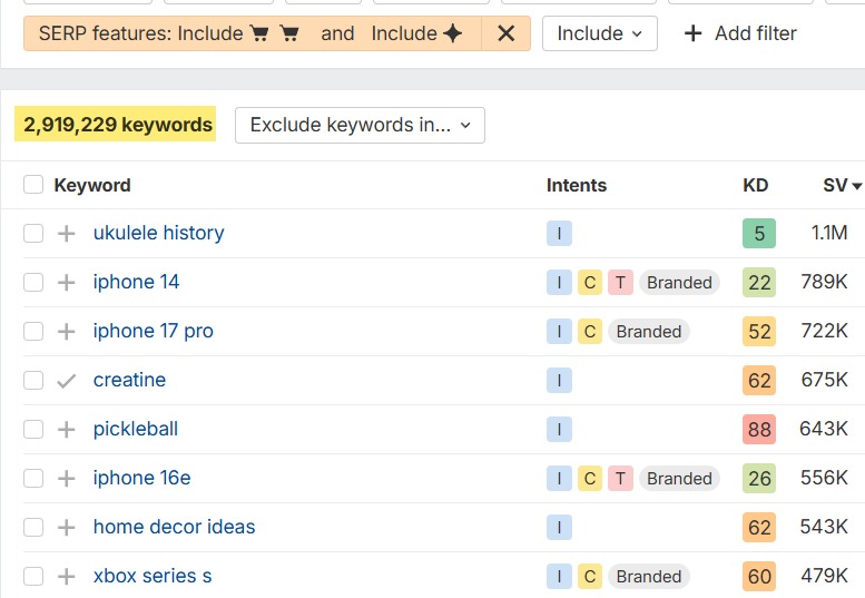 We then filtered the dataset to just search results that included an AI Overview, which resulted in 2,919,229 shopping keywords with AI Overviews present.