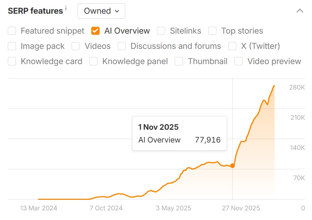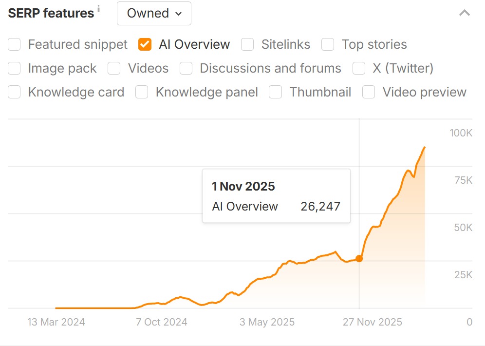 In November 2025, Ahrefs reported that AI Overviews only appeared for 2.1% of transactional queries in Google Search. At the time, eCommerce stores were fairly immune to AI Overviews reducing clicks within Google’s search results.